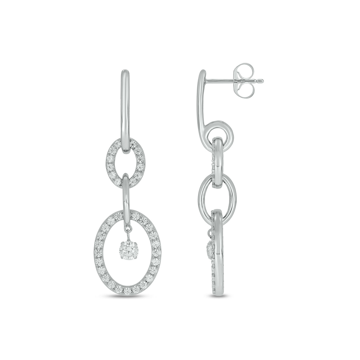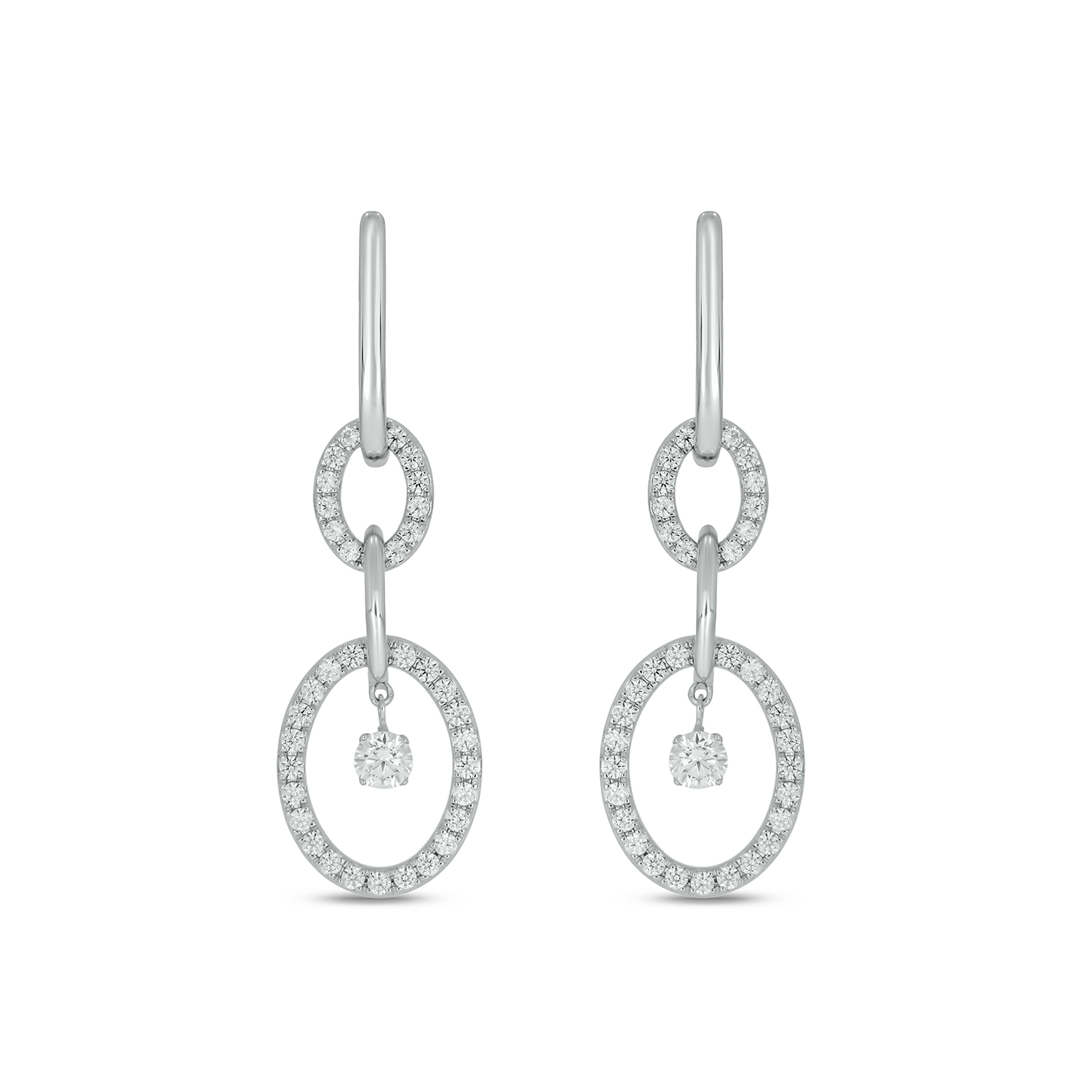 Each earring showcases a polished top hoop, elegantly adorned with dazzling pave-set diamonds. Connected below are two gracefully linked oval shapes, also lined with sparkling diamonds. The true allure lies in the lower, larger oval, which cradles a single, freely dancing diamond at its center. This unique setting allows the diamond to continually catch and reflect light, creating an unparalleled, animated sparkle.