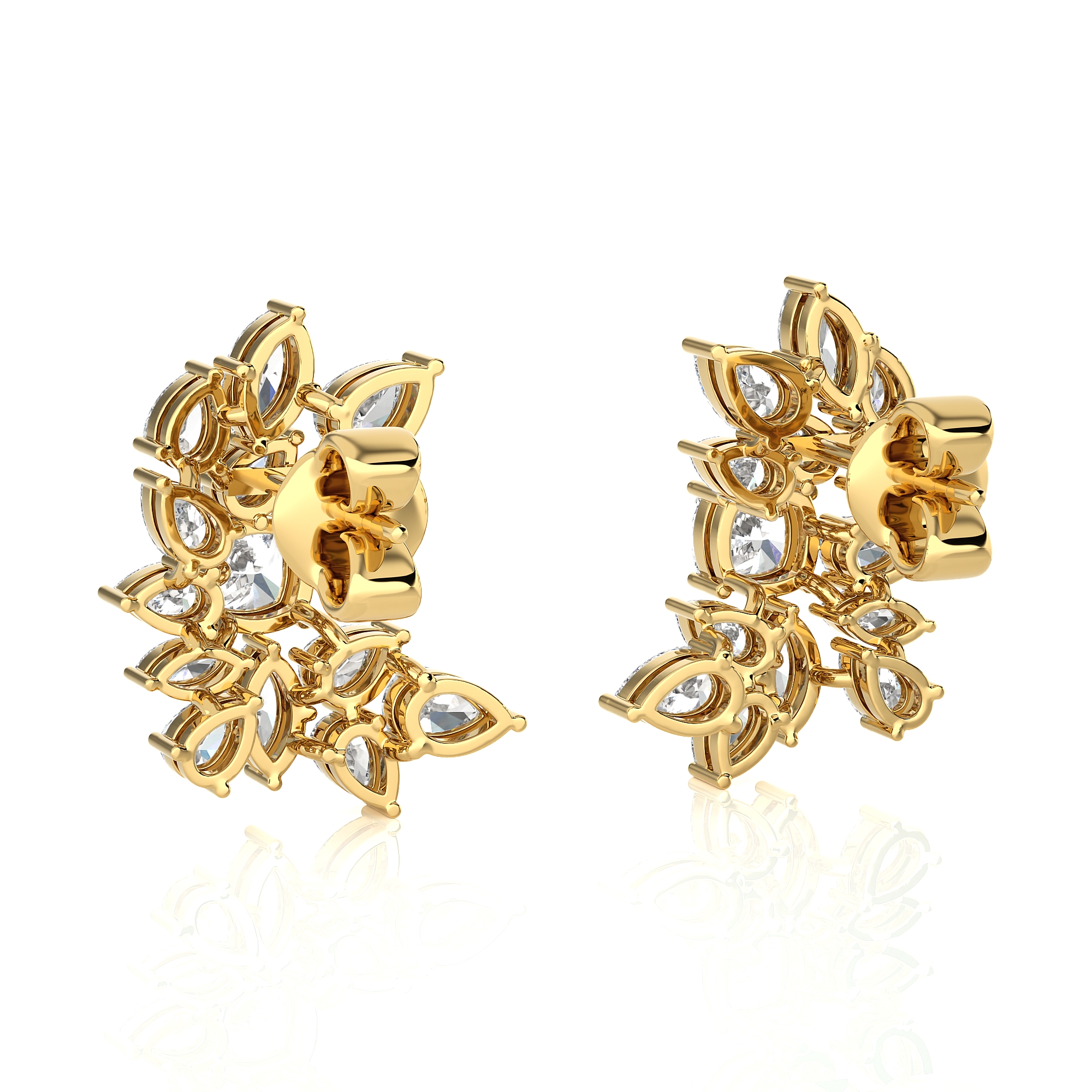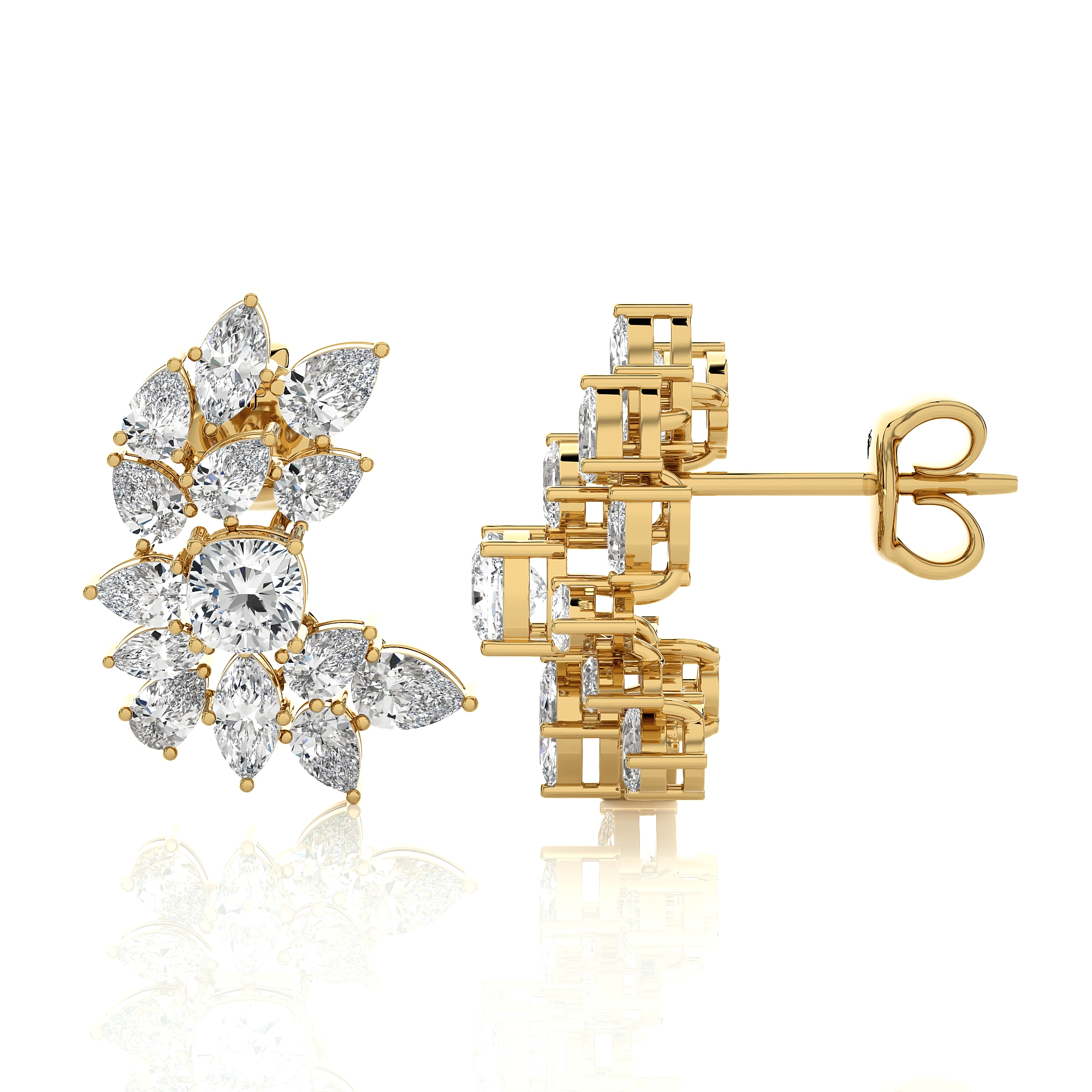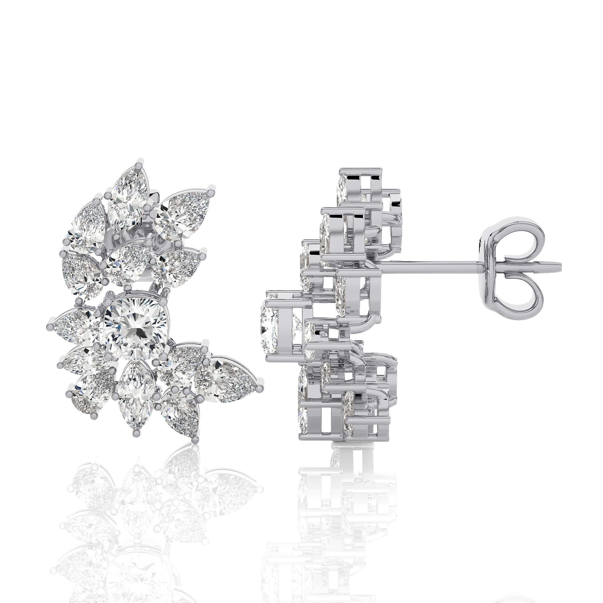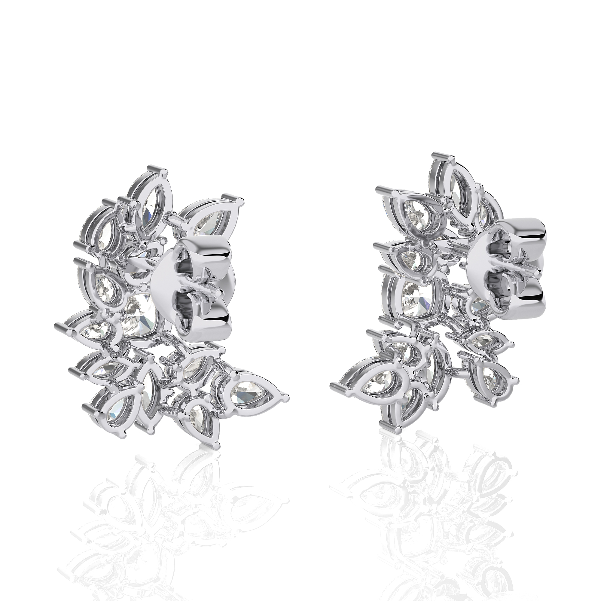 Each earring features a breathtaking arrangement of meticulously selected diamonds, expertly set to create a floral-inspired cluster. The unique design showcases a central round brilliant diamond, surrounded by a constellation of marquise and pear-shaped diamonds, forming a graceful, asymmetrical curve that gracefully adorns the earlobe.